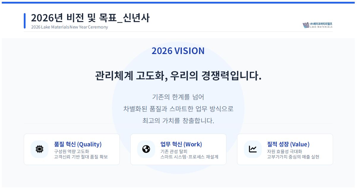 대표이사 신년사와 경영진 각오 한마디를 통해 2026년 레이크머티리얼즈의 시작을 알리는 뜻 깊은 시간이었습니다.