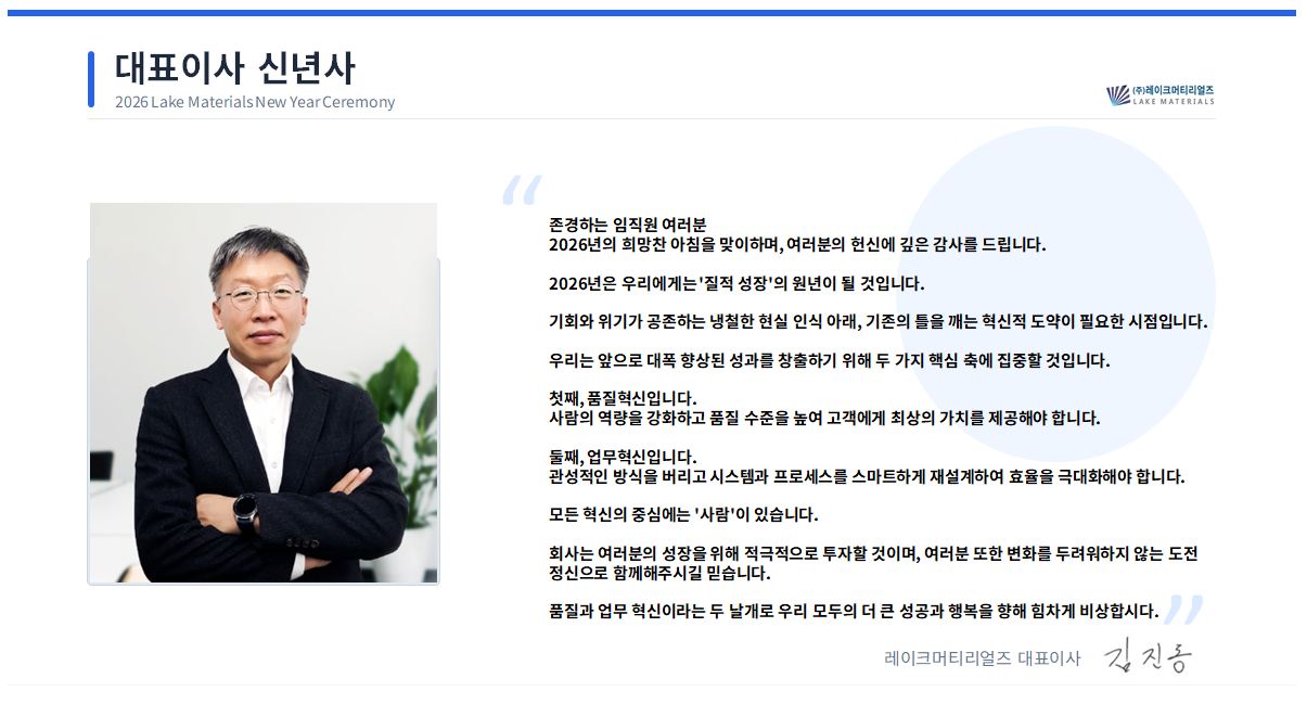대표이사 신년사와 경영진 각오 한마디를 통해 2026년 레이크머티리얼즈의 시작을 알리는 뜻 깊은 시간이었습니다.
